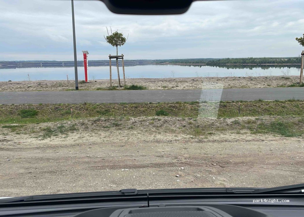 Außergewöhnliches Ambiente - der F60 im Rücken - der See vor dir - und das alles in der ehemaligen Tagebauregion. Seit 2.4. 10,-€ für 24h. Ohne alles. Nachts ruhig. Gestern war es ziemlich laut-Cross-, Quad-, Motorradfahrer und die heimische Tunerszene unterwegs.