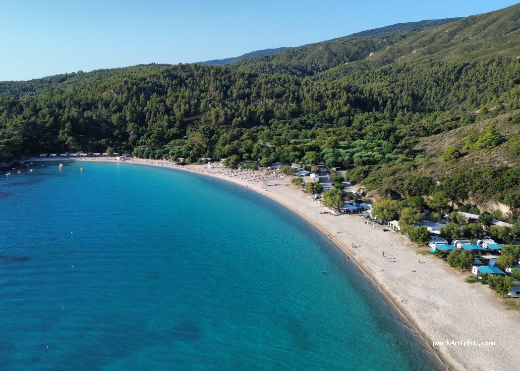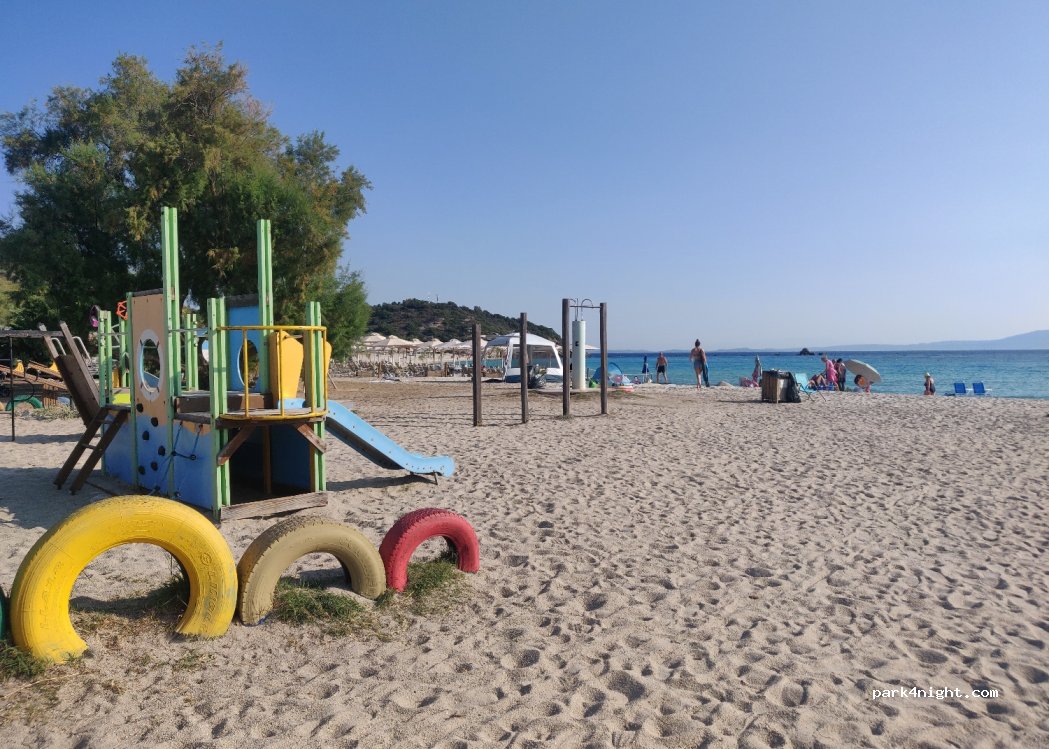 plaja larga de peste 1 km cu nisip fin si apa curata. Ideala ptr familii cu copii mici sau persoane care nu stiu sa inoate. Camping fabulos cu nisip fin si padure de pini si munte in spate. Va recomand sa va campati in zona 500 ca este aproape de plaja. Orasul Sarti la 15 km si orasul Nikiti la 35 km.