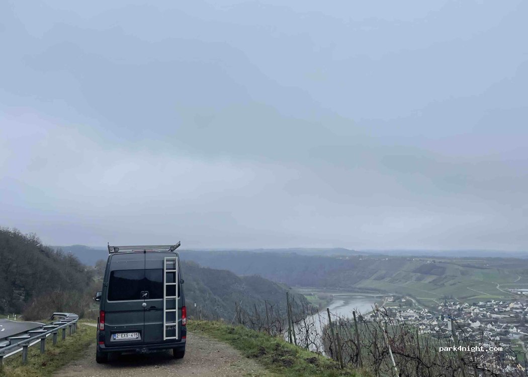 Sehr schöner Blick auf die Mosel. Für mich etwas nah an der (nachts ruhigen) Straße, aber trotzdem ein super spot! Morgens um 5:30h kam ein Winzer, der den Platz zum Arbeiten gebraucht hat. Er war nicht unfreundlich und ich konnte mich wieder an den Platz stellen als er fertig war.