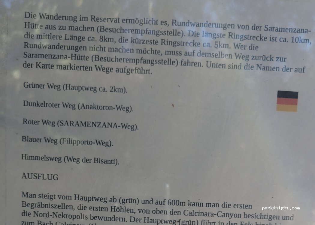 Kostenlose Parkplätze im Herzen von Pantalica. Offizieller Parkplatz am Naturparkzentrum. Übernachten auf Nachfrage erlaubt, die freundlichen Parkranger lassen dann gerne die Toiletten offen und das Licht an. Das Eingangstor wird zwischen 17.00 und 7.00 Uhr geschlossen (aber nicht mit Schloss versperrt).