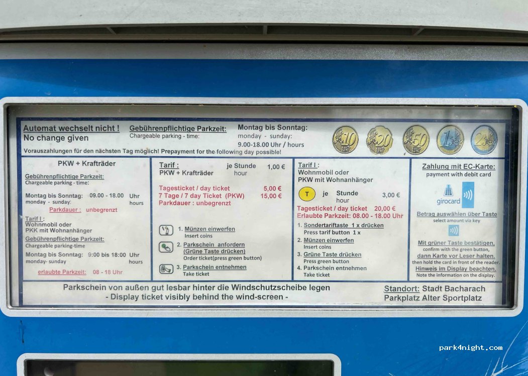 Parken für Wohnmobile nurnoch tagsüber von 8:00 bis 18:00 Uhr, davon kostenpflichtig von 9:00 bis 18:00. Siehe aktualisiertes Foto vom Parkautomat!