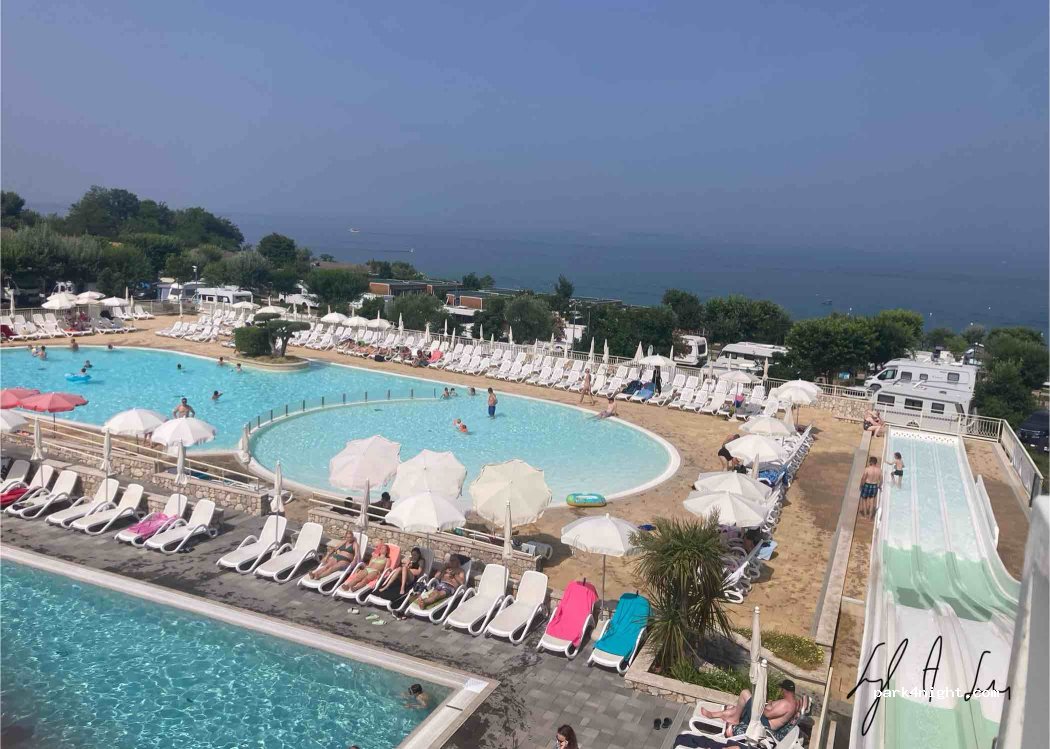 Loved this campsite we we’re parked up along side Lake Garda with amazing views. Electric and fresh water by your pitch as well as individual pipes for emptying grey on pitch as well a main empty slab drain at the top by the bins. Sanity facilities were 6* cassette emptying was the cleanest we’ve ever seen. Plenty of washing/ drying machines. Swimming pool, shop, restaurant and pool cafe, staff were excellent, barrier to get in and out monitored by reception. Gate on lakeside locked at midnight opens at 6am. Lazise 20min walk along beach and side rd. we will come back.