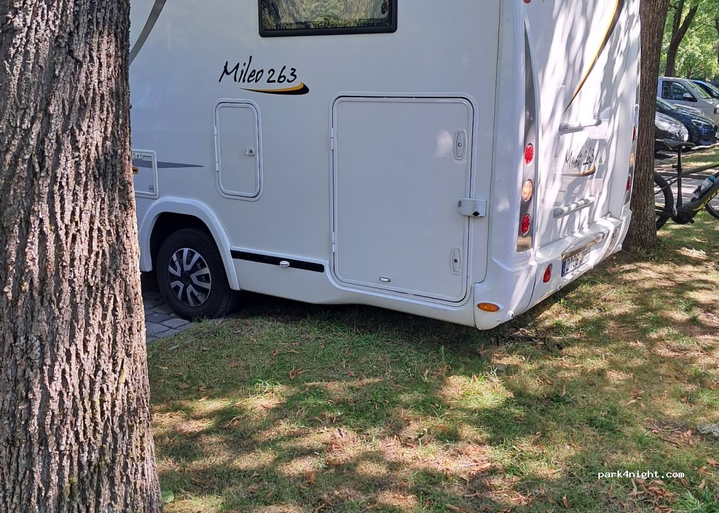 Places de parking courtes sauf quelques unes le long de la route. Circuit de bus qui roule toute la nuit et donc bruyant et en prime réveillé à 6 h 00 oui oui je dis bien 6 h 00 par les agents de la ville qui passent autour du camping car avec les debroussailleuses et les tondeuses.