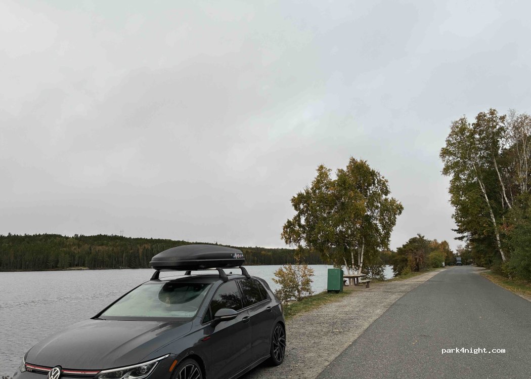Superbe endroit au bord d'un lac avec beaucoup de tables pour pickniquer. Aucun avis qui interdise d’y coucher. Un vr de 40 pieds peut y aller. Entrée et sortie asphaltée