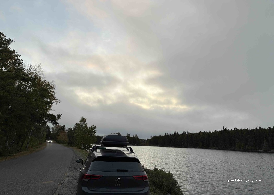 aire de repos au bord de la route , accès lac direct ,coucher de soleil au top, avec en plus le chant des Huards au coucher du soleil. Parfait pour une pause de jour où une nuit malgré la proximité de la route