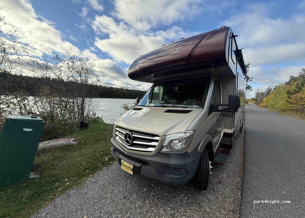 Nous y avons passé une superbe nuit. En bordure de l’autoroute pas si bruyante pendant la nuit. Possibilité de s’installer à quelques pieds du lac et d’y faire une baignade. Idéal pour un véhicule de classe B ou C.