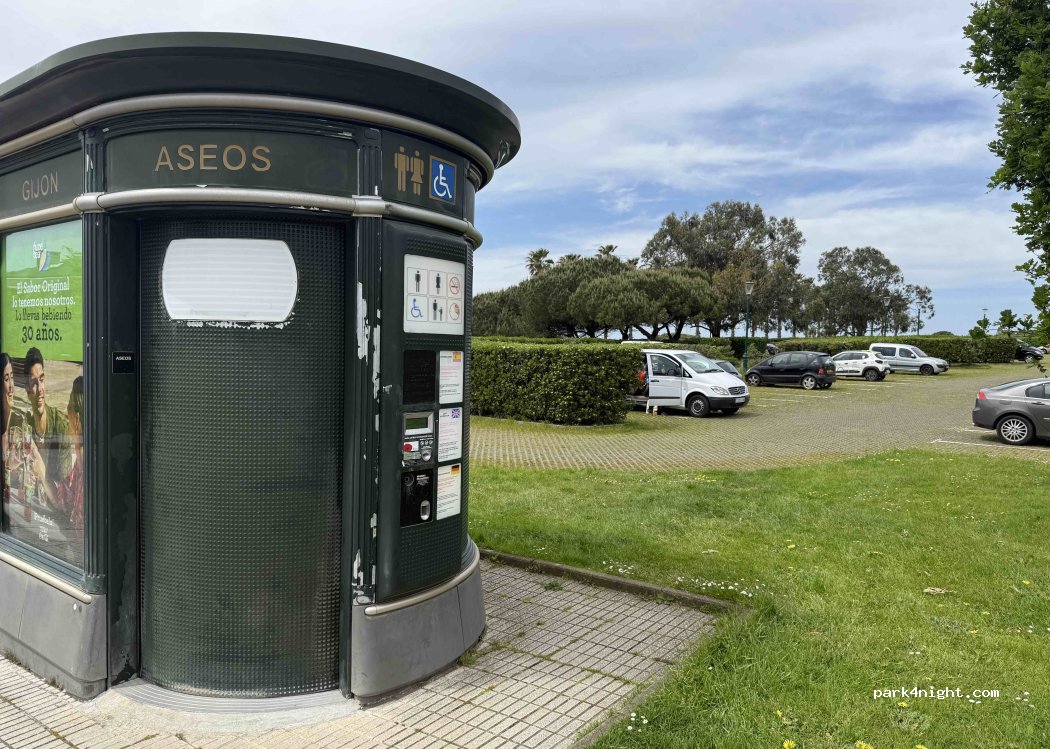 Buen sitio para dormir. A 15 minutos a pie del centro y al lado del paseo marítimo de Gijón. Hay una fuente en el parque. Lugar limpio y con baño público. Piden pagar 0.30 centimos pero al no funcionar la maquina admite cualquier targeta aunque sea del medico. Si volvieramos a Gijón repetiriamos seguro. Fàcil encontrar aparcamiento para turismos y furgonetas, mas difícil para autocaravanas.