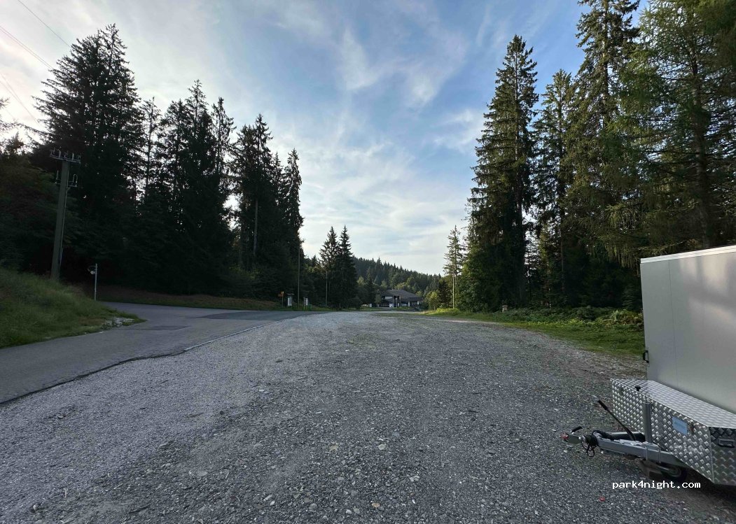 Grosser Parkplatz beim beheizten Schwimmbad. Im Winter dient der Platz dem Skilift. Untergrund Schotter im unteren Teil etwas schief im oberen eben.