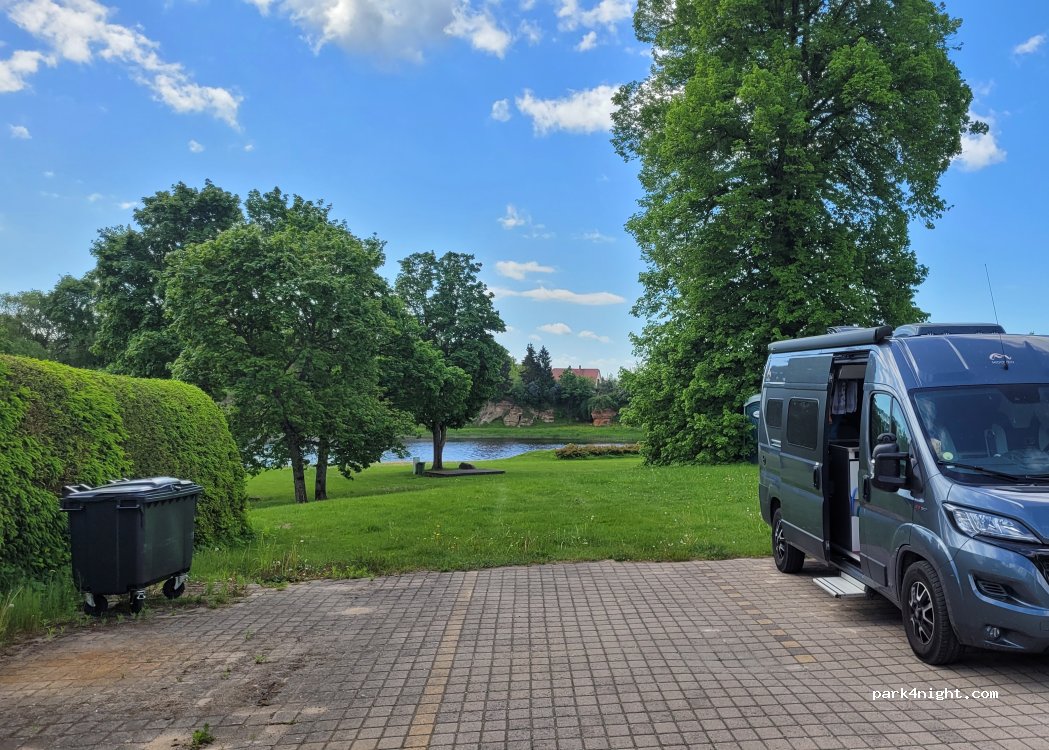 Ruhiger und leerer ebener Parkplatz. Aussicht auf Fluss - Vögelgezwitscher die ganze Zeit. Wir haben hier eine ungestörte Nacht verbracht. (Der Müllcontainer ist inzwischen mit einem Vorhängeschloss gesichert. Über die Straße hinweg besteht Möglichkeit Glas, Plastik und Papier zu entsorgen. Die vorhandene Stromversorgung ist für Elektrofahrzeuge.)