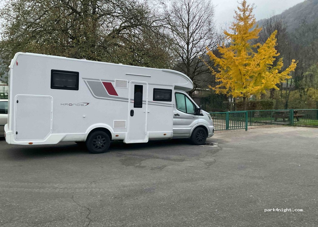 Aire avec services gratuits, nous avons passé la nuit du 3 août sans problème, le stationnement est à partager avec les voitures, mais pour une nuit c'est correct de plus il y a même une table de pique-nique dans square. Merci à la municipalité