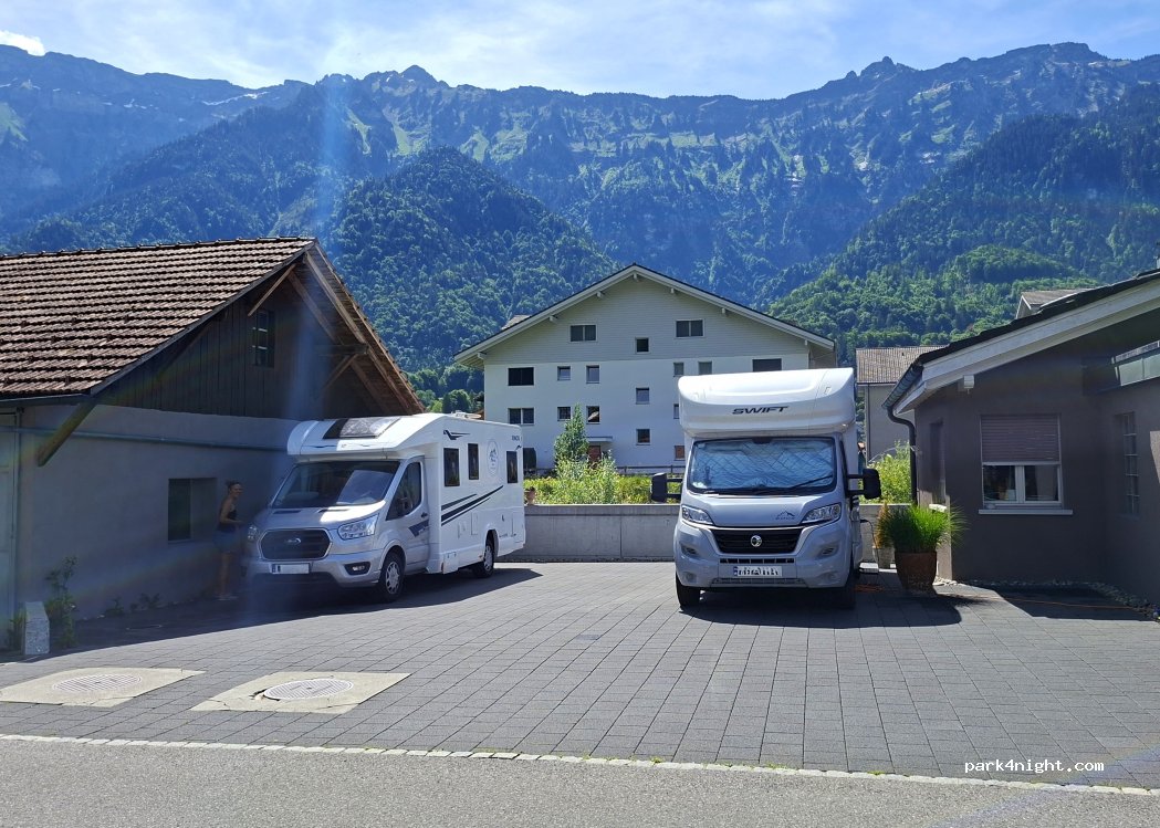 Einfacher gepflasterter Stellplatz zwischen zwei Wohnhäusern. Besitzer ab und an nicht da, dann trifft man andere Familienangehörige oder wirft das Geld in den Briefkasten, ganz unkompliziert. Sehr gut, da unkompliziert und einfache Stellplätze für eine Nacht in Interlaken rar gesäht sind. Achtung für Strom wird ein Schweizer Stecker benötigt, Euro Schuko oder CEE passt nicht in die Dose an der Wand (vorne an der Sitzecke). Adapter kann für 20 CHF am nahegelegenen Campingplatz ausgeliehen werden. Wir kommen gerne wieder.