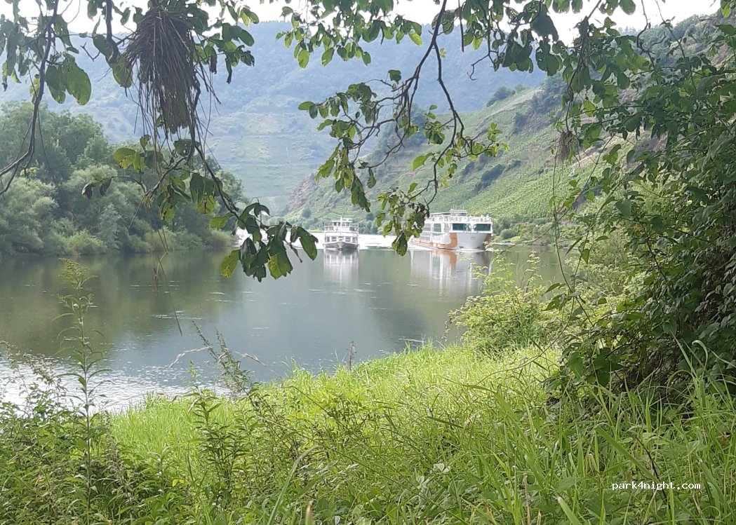 Het was niet makkelijk om een mooie camperplek te vinden in de buurt van Cochem. We zijn hier beland, op 27km fietsen van Cochem. Morgen verkennen. Mooie no-nonsense plek. Mooie plaatsen, niet afgebakend, niet druk, dus plaats genoeg. Direct aan de Moezel, zicht op de wijngaarden, schepen, in de verte de sluis... We hebben hier 3 nachten gestaan. Heerlijke plek. Zoveel te doen rond de Moezel...