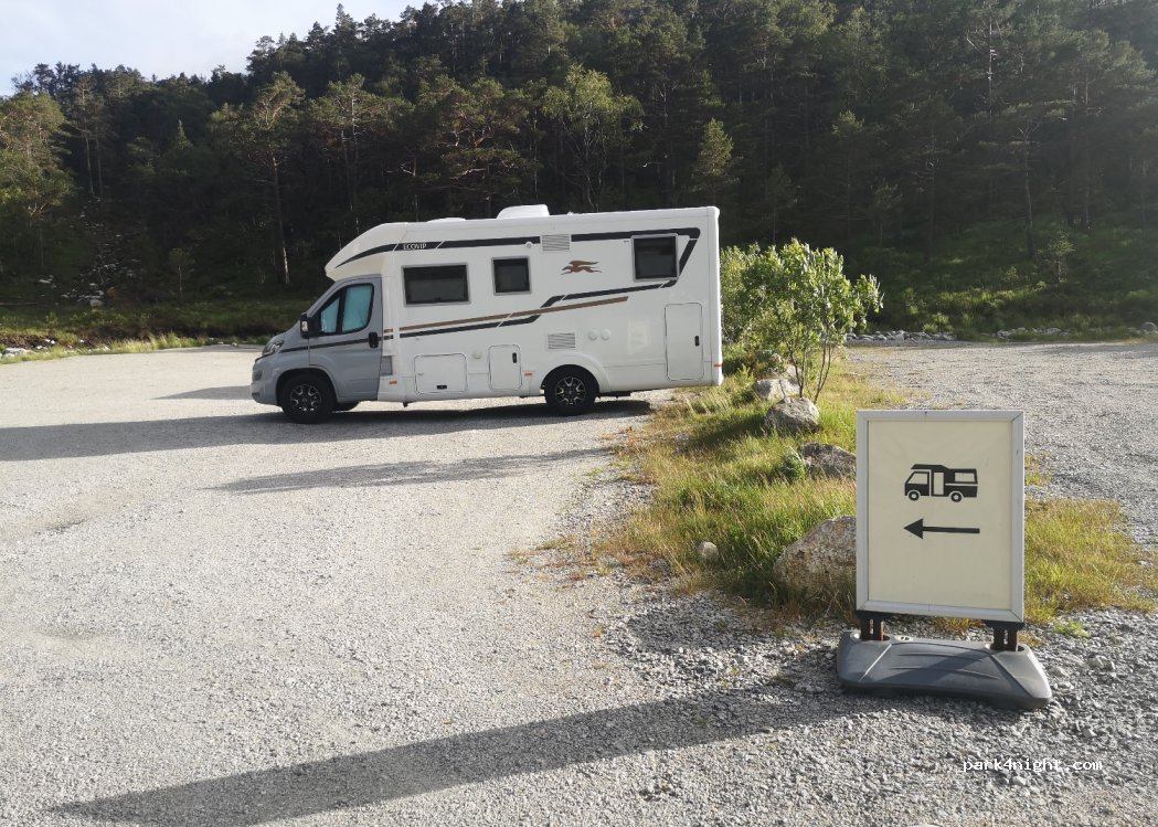 Großer Parkplatz zur Besichtigung des Prekistolen. Sehr gute Organisation, man wird von verschiedenen Angestellten zum nächsten freien Platz gelotzt. Allerdings sehr teuer: Egal wie lange man steht, man muss 250NOK (in Münzen oder mit Kreditkarte) bezahlen. Camper und Wohnwagen sind von 24.00 - 6.00 verboten. In der Hauptsaison ist der Platz recht schnell voll. Am Platz sind 3 Toiletten, welche aber recht dreckig sind. Zur Besichtigung des Prekistolen am besten auf einem der unteren Campingplätze parken und dann mit dem Bus hochfahren.