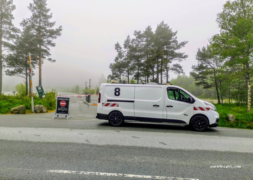 The upper parking lot was already fully booked at 8am, so the staff directed us to this one. Very convenient parking, large spaces for campers. No overnight stays in the camper. Before leaving we paid NOK 250. You scan the ticket from the machine when leaving at the barrier.