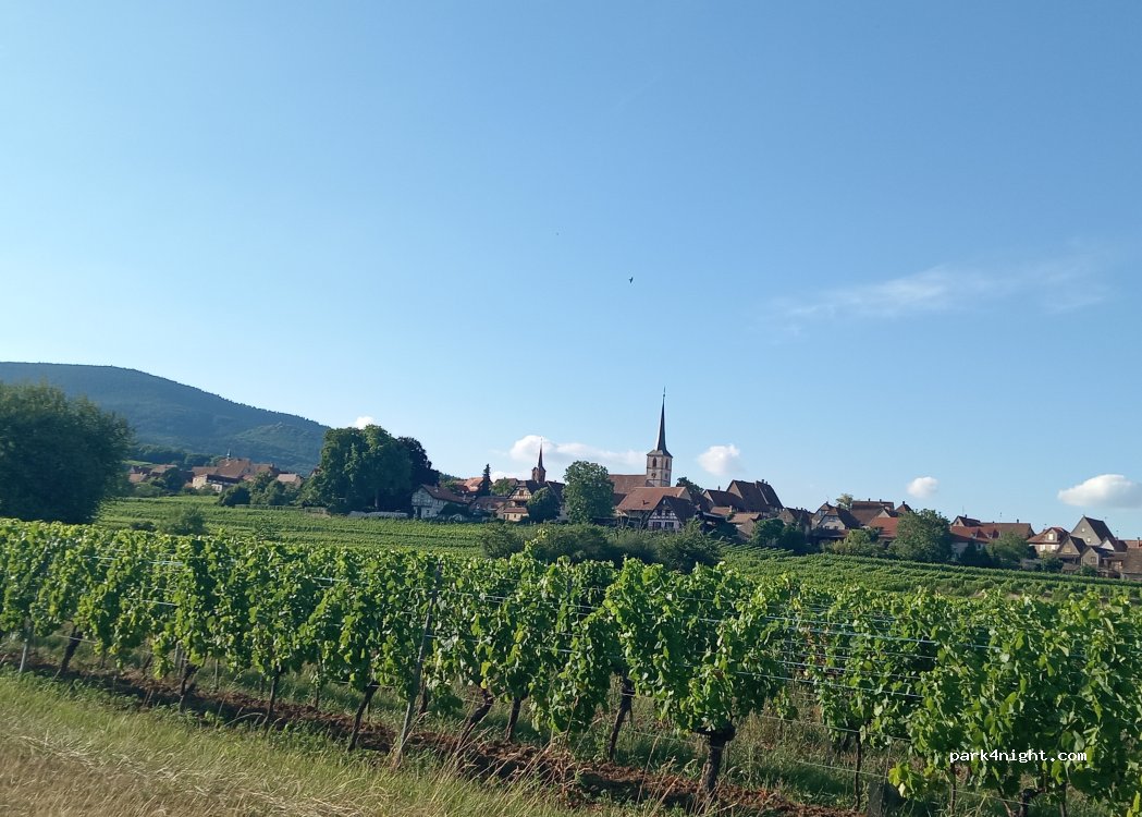Aire de pique nique avec magnifique vue sur Mittelbergheim. Quelques arbres pour un peu d’ombre. Parfait pour aller visiter ce magnifique village à pieds. Mais pas recommandé pour y passer la nuit, car juste à côté d’un giratoire.