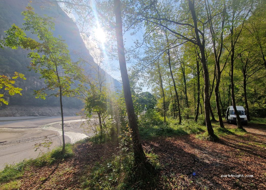 Aan het meer Lago del Mis is dit een prima rustige locatie om te overnachten. Wel langs de weg maar na 21.00u is t rustig tot ver in de ochtend. Beschut voor de zon door de bomen. Geen 4G