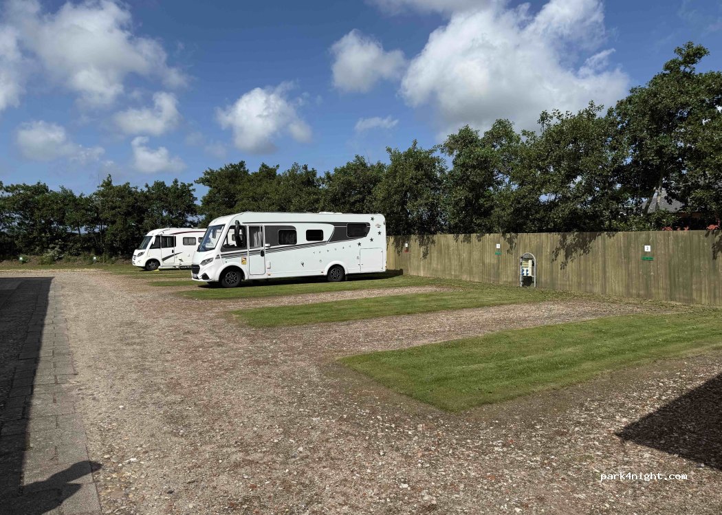 Nice, clean, small mobile home parking space in the industrial area, surrounded by a high wooden fence - a view of meadows and fields to the rear. Supply and disposal, toilet emptying, electricity, WLAN, lounge, toilet, shower and best of all a sign with which you can reserve the place after payment if you want to go to the beach. Very nice operator who stops by in the morning and in the evening to make sure everything is clear.