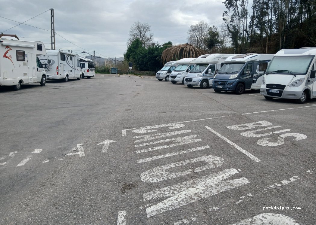 Parking public avec emplacement réservé aux camping-cars. L'aire de stationnement est principalement plate. Elle dispose d'un point de vidange pour les eaux usées et d'un robinet d'eau potable. Le camping y est interdit. Le parking est situé à proximité de la gare (quasiment calme), d'où part le train pour Santander. Une laverie automatique se trouve à environ 100 mètres. Une aire de jeux pour enfants est située de l'autre côté des voies.