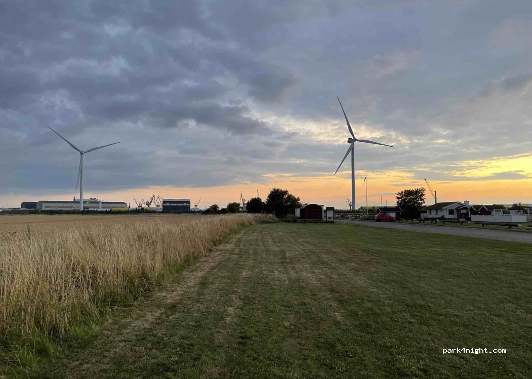 Für eine ruhige Nacht perfekt. Das linke Rasenstück für autarke Camper - auch größere gut geeignet. Die Wasserseite mit Strom und Wasser für 75 DKR oder 10€ zum Teil zwischen Bootstrailern, aber mit weitem Blick. Am Ende des Weges ist eine kleine Bootsmarina. Der Verladehafen für Vestas-Windkraftanlagen ist mal ein etwas anderer Ausblick! Er stört jedoch nicht die Ruhe.