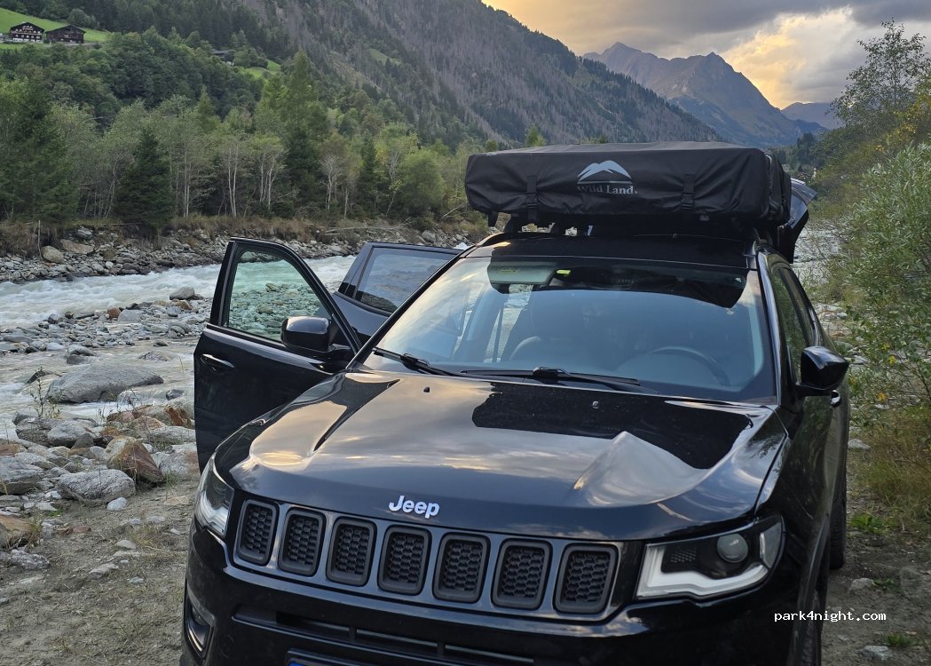 Three consecutive open spaces along the way. Each can accommodate a vehicle. The nearby river is quite loud. Staying overnight is prohibited