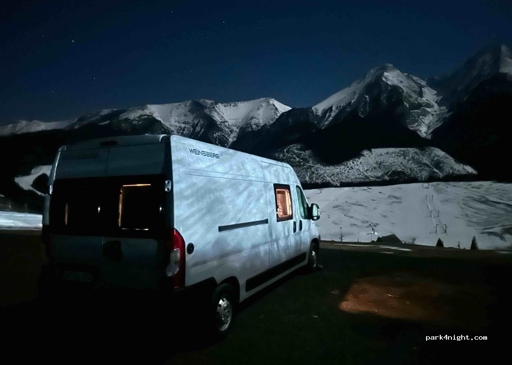 È un semplice parcheggio, costo 8 euro ma nessun servizio. Vista eccezionale sui monti Tatra. Di giorno un po’ rumoroso per la strada adiacente e un cantiere confinante. Per una notte perfetto.