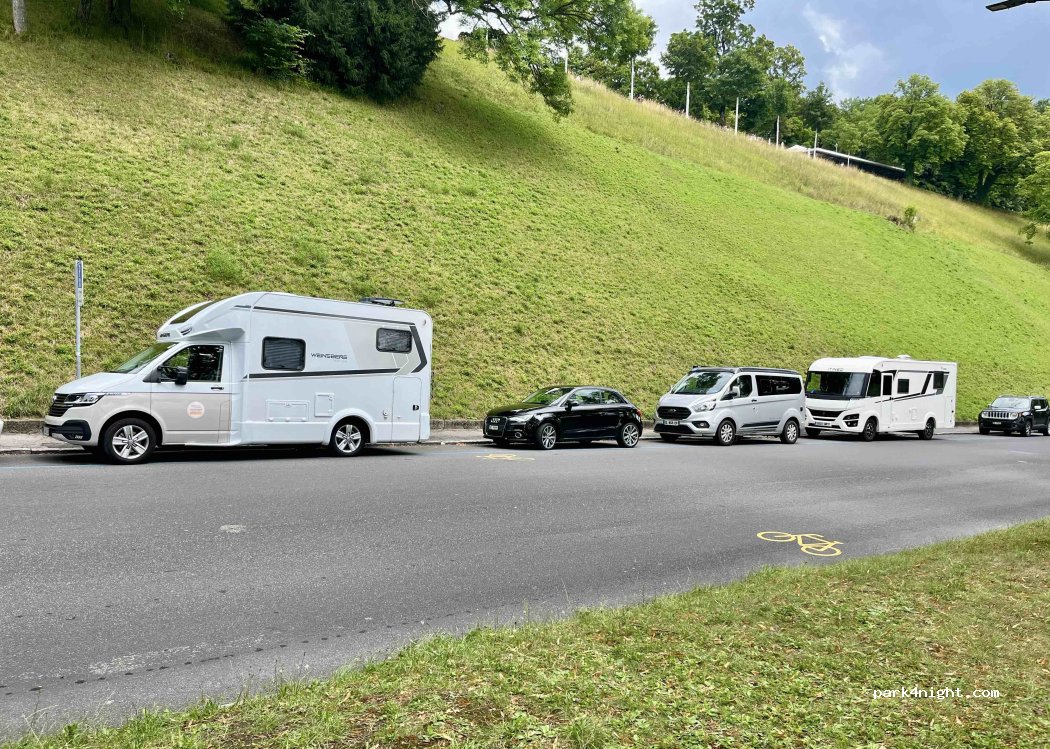 "leicht abfallend" ist die absolute Untertreibung. Deshalb und weil es eine stark frequentierte Hauptstraße ist, ist der Platz überhaupt nicht zur Übernachtung geeignet! Man kann hier mit Parkscheibe für 1h kostenlos parken! Wenn ihr hier übernachten wollt, dann sucht euch eine ruhige Seitenstraße auf dem Obstberg, das hat für uns gut geklappt!