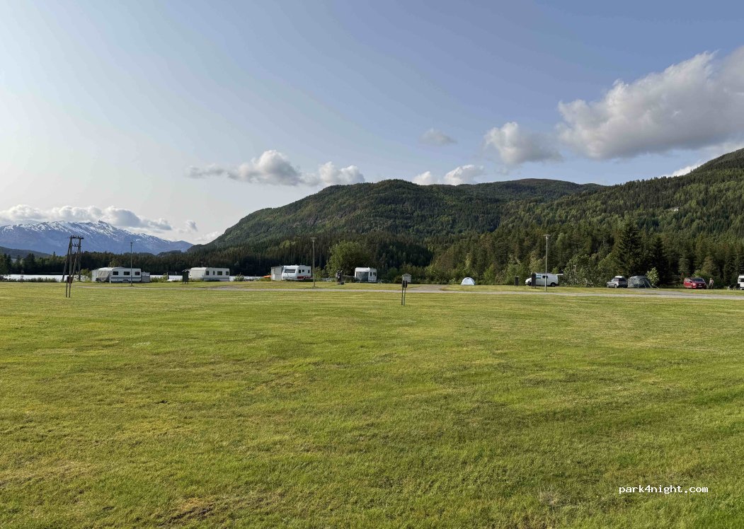Grote camping met grote plaatsen waar je naar toe gebracht wordt en je moet de camper zo neerzetten dat alle campers en caravans met de neus dezelfde kant op staan. Prijs in het hoogseizoen voor camper, 2 personen en elektra 400NOK. De camping ligt direct aan de weg die je vooral bij regen wel behoorlijk hoort. Gelegen aan een mooi meertje. Er zijn te weinig douches (10NOK per 7min) en toiletten voor een camping van deze omvang. 1 toilet gebouw waar wij wel ver vandaan stonden. Wel over het terrein verspreid watertappunten met slangenwagens om de camper of caravan te voorzien van water.