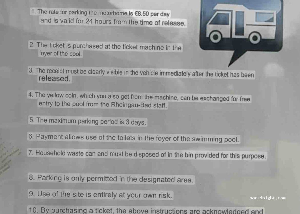 Wir standen eine Nacht ganz allein hier. Donnerstags kann man ab 16 Uhr das Schwimmbad wegen Vereinsschwimmen nicht benutzen. Dementsprechend voll ist dann der Parkplatz wegen Elterntaxis bis gegen 20 Uhr. In der Zeit könnte es schwieriger sein einen Platz zu finden.