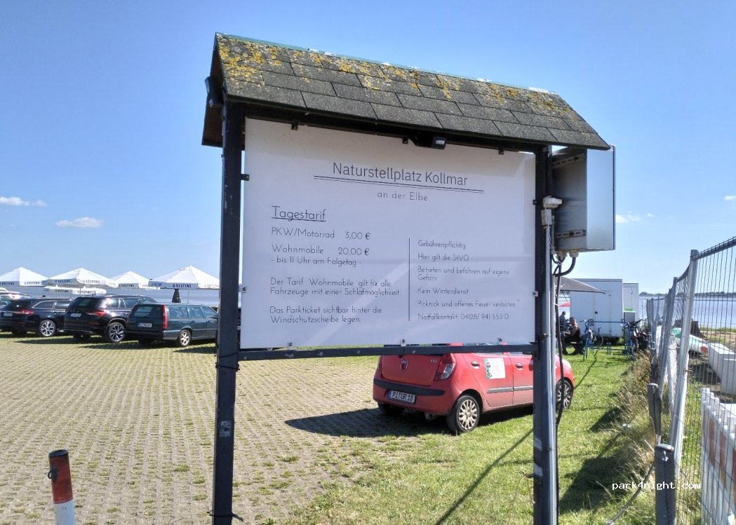 „Naturcamping Kollmar“ Soweit so gut. 5 Sterne für die Aussicht auf die Elbe. Aber sonst nichts außer einer frisch gemähten Wiese. Da ist jeder gepflasterte Stellplatz angenehmer zu befahren und vor allem zu begehen… 20,- € sind für die Leistung zu teuer ! Keine Ver.- und Entsorgung, Öffentliche Toilette ist 150 m entfernt. Bis 11.00 Uhr muss man den Platz verlassen.