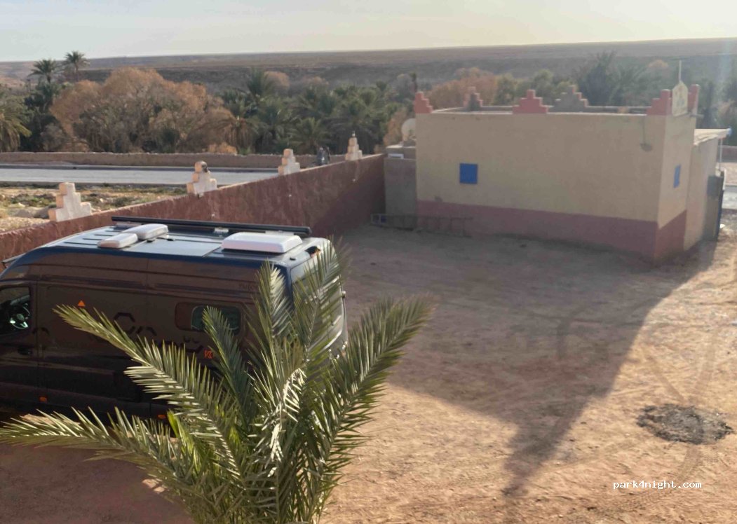 Une petite cour intime et fermée pour 4 cc, si le vent souffle c'est top, bien protégé et lieu tranquille. On recommande le repas typique kapdal, bonne cuisine, achetez les dattes de la ferme un regal. Halte sympathique pour aller visiter les ruines de l'ancien Meski. La source bleue est asséchée. Faite une partie de pétanque avec le patron Zaid qui est un champion.