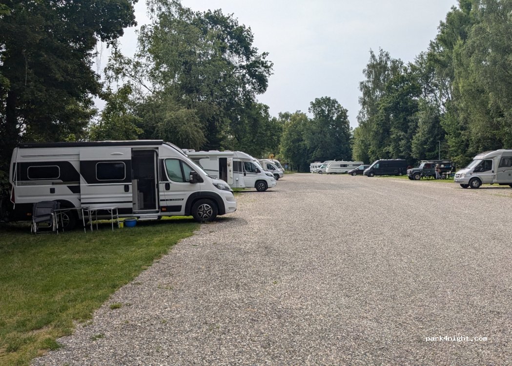 Large area for parking. Quiet at night. Cost 10€ per night. Paying machine wasn’t working. In the morning a man came and collected payment. For electricity you pay with coins. Toilets was not nice. It’s just by the river but you can’t see it because of the tall hedge.