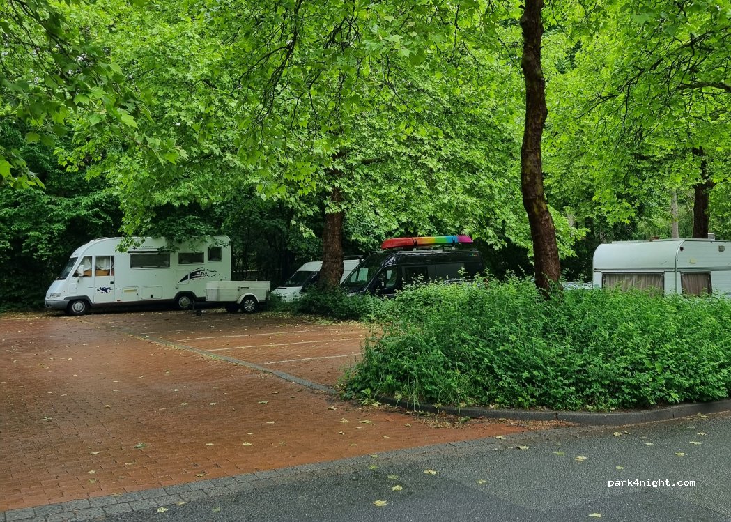 1 nacht hier gestaan. Even gepuzzeld voor de beste plek. 2e ingang rechts aan de rechterzijde. Dit was de meest rechte plek. Het was rustig, snachts nog wel best veel verkeer over de weg ernaast. Voor ons geen probleem. Je loopt zo het Bürgerpark in. 15 min lopen naar alle monumentale gebouwen. Glas en kledingbak aanwezig. Kleine prullenbak alleen in park.