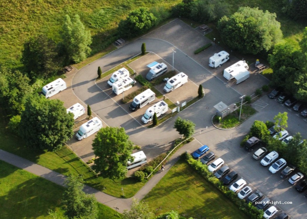Großzügige Stellplätze. Waren bei regnerischem Wetter dort. Die gepflasterten Plätze sind dann super! V+E vorhanden. Sehr ruhig. Nachts beleuchtet.