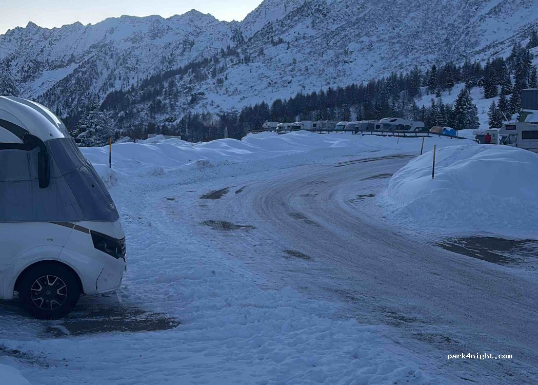 Ottimo parcheggio per la notte, con tanti camper e molto tranquillo, bar e negozi nelle vicinanze, vicino agli impianti.