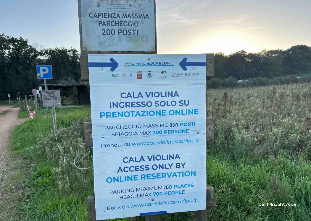 Parcheggio dalle 8:00 alle 21:00, per auto e camper. In questo periodo, luglio 2021 accessibile solo tramite prenotazione sul sito del comune di scarlino e costo di 30 euro. Accesso da una facile pista di circa 1 km. La spiaggia di Violina si trova a 2 km a piedi.