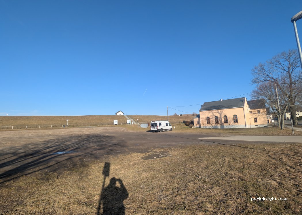 Beschreibung trifft es gut. Eigentlich ein schöner kostenloser Platz direkt am Naturbadeteich. Keinerlei Versorgung. Der Landgasthof am Parkplatz bietet bürgerliches reichliches Essen zu moderaten Preisen. Zur Supermarktfiliale mit separatem Bäcker und Metzger ein paar Meter über die Straße. Ich habe hier gut und ruhig geschlafen. kann mir aber vorstellen das es im Sommer voll und laut ist.