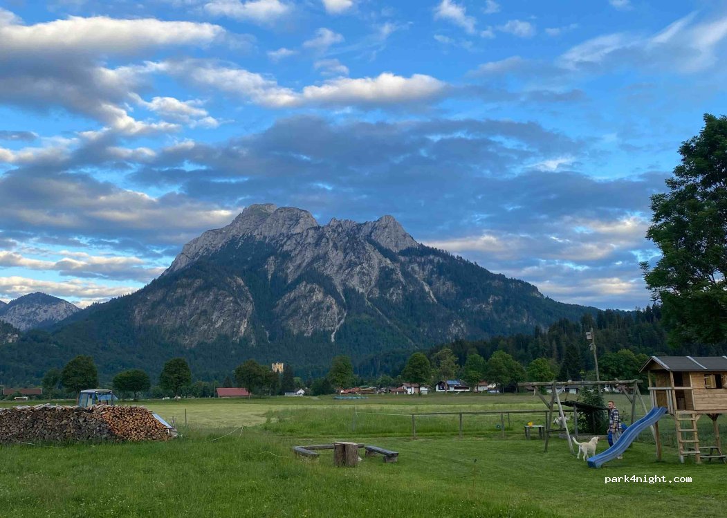 Sehr schöner Stellplatz, für 3 Fahrzeuge. Super ruhig, bis auf die Kühe die morgens aktiv werden. Land- Idylle pur mit Aussicht auf Neuschwanstein. Feuerstelle und kleiner Spielplatz. Sanitär jeweils 1x für Herren und Damen, sehr sauber. Sehr nette Gastgeber. Keine Ver- und Entsorgung vorgesehen. Mülleimer vorhanden.