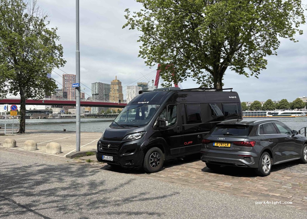 Another way to park in Rotterdam. Right under the bridge. 7m mobile homes fit here. 15 m from the center, cross the bridge directly above. There is a playground in the front and it is very good for dogs