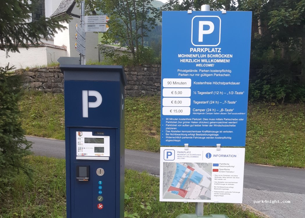 kostenfrei, offiziell eine Nacht für WoMo erlaubt, abseits der Strasse, sehr ruhig, klasse Angebot der Gemeinde Schröcken!!!