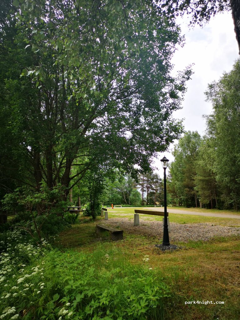 Great place near a river, with little games for kids, calm late at night though next to a main road; you pay in a box 7€ or 70 SEK; you need though to take the keys, on a board in the park field, to go to the toilets and shower that is in the same cabin on the other side of the road!all services included: tap water, grey water/black water to empty. One night is fine for a break.