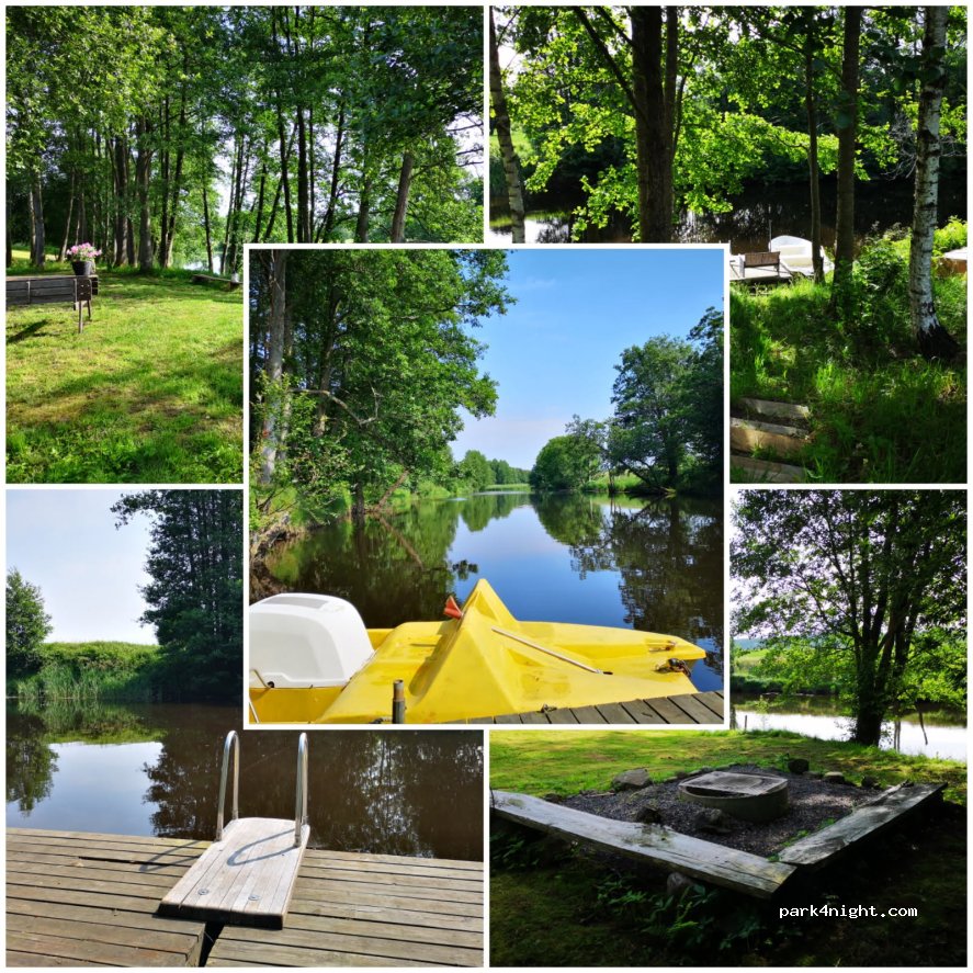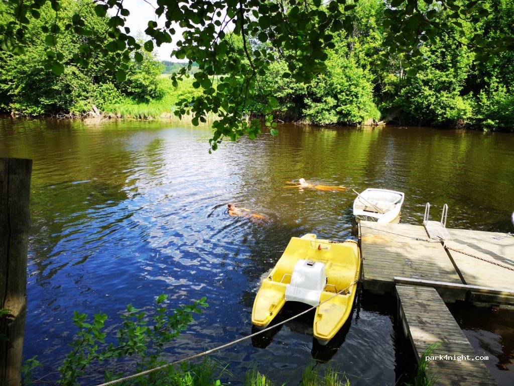 Nice spots, enough room for each camper. Forest feel, next to a quiet river. Use of rowing boats and pedal boat, shower/toilet, filling drinking water and emptying grey water and toilet for €10,- or 100SEK per night. Like it.