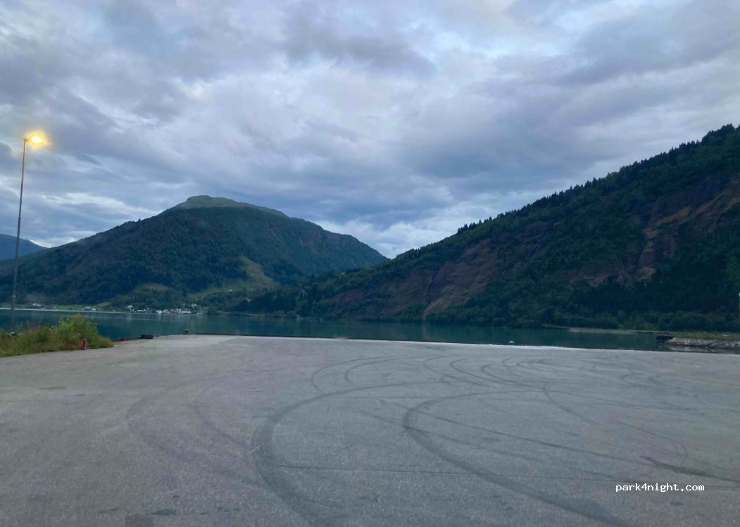Lauter Stellplatz, Jugendliche treffen sich mit Autos und driften auf der Freifläche. Ging bis 2 Uhr morgens. An Schlaf ist nicht zu denken. Aussicht auf einen Fjord ist gut. In einem Industriegebiet gelegen.