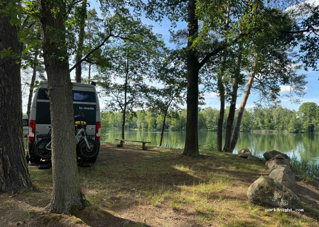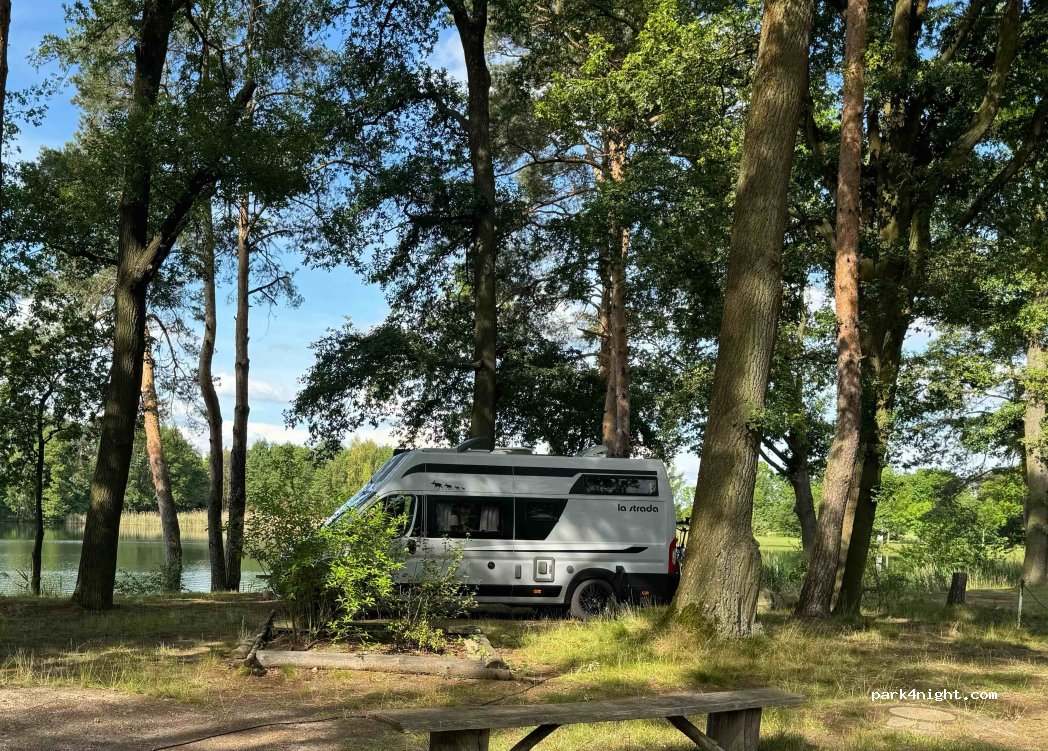Der Campingplatz liegt direkt am Waldsee. Man kann frei stehen, keine Parzellen. Unter Bäumen mit Blick auf Wasser, traumhaft. Leider sind auch hier die Preise gestiegen. 28€ für 2 Personen mit Womo plus Strom nach Verbrauch. Der Sanitärbereich ist OK aber verbesserungswürdig. Die Waldgaststätte hat nur am Wochenende geöffnet. Zur Zeit wenig besucht. Man steht hier fast alleine.