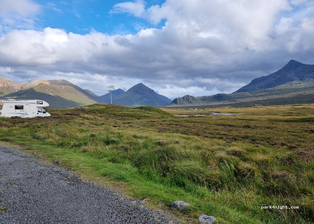 Spot nuit que je recommande sur une route secondaire avec très peu de passage. Calme et sur. Places pour 2 vans. Vue sublime sur les sommets de Skye au réveil.