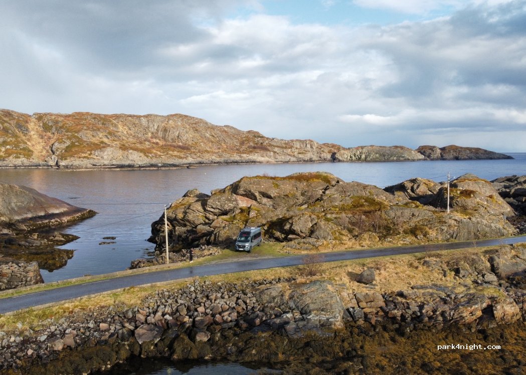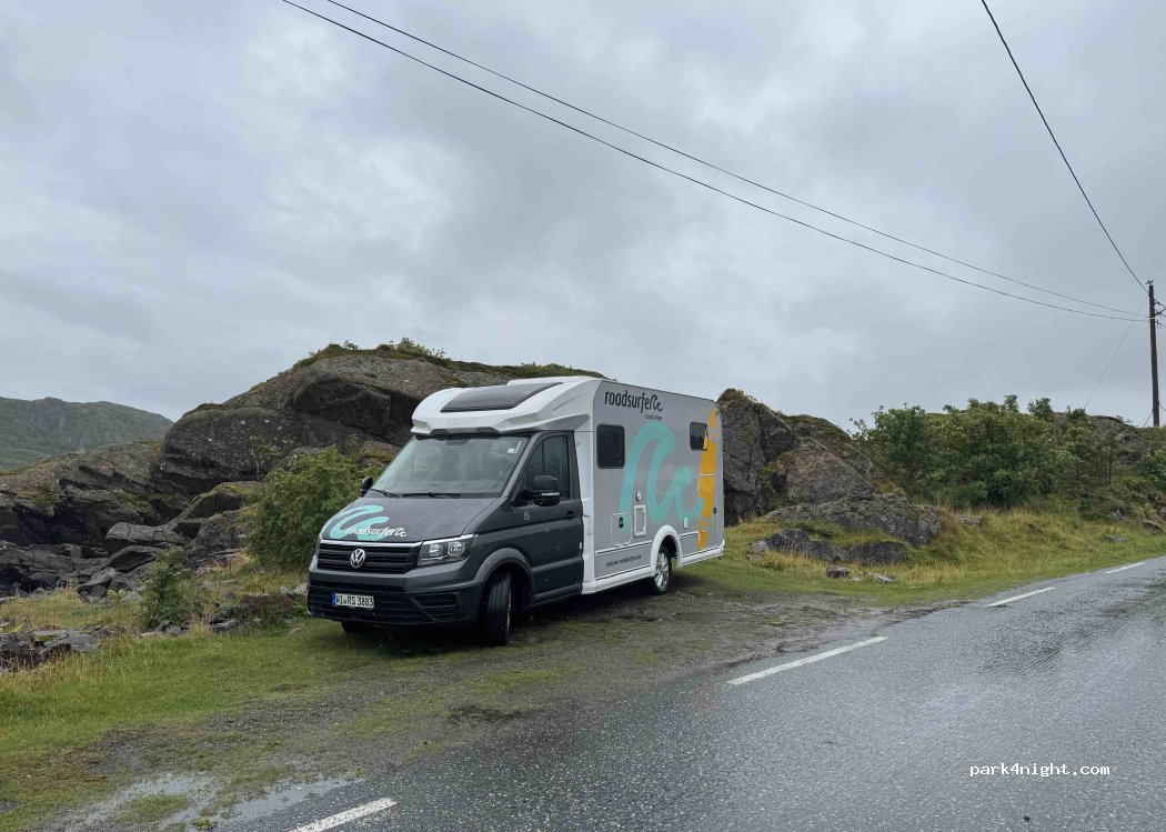 Kleine Ausbuchtung an der Straße. Gelände recht eben. Aussicht für die Lofoten eher mäßig.