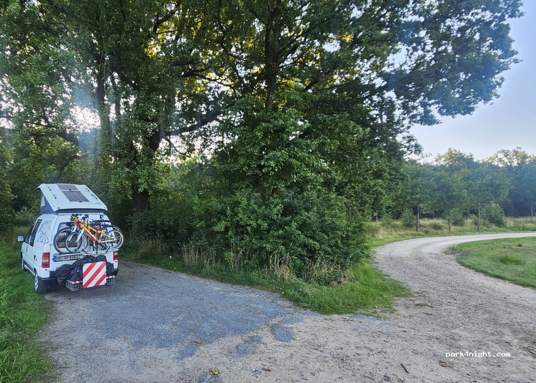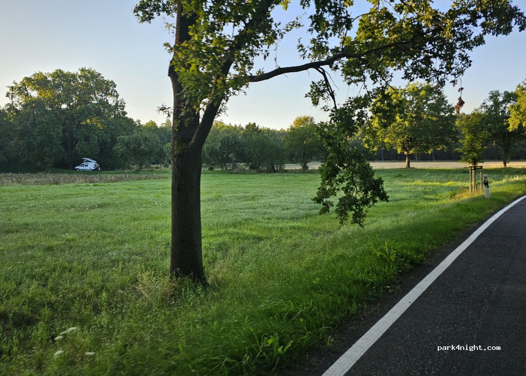 Kleiner asphaltierter Stichweg unter grosser Eiche, ca. 200m von der Strasse enrfernt. Ruhig und empfehlenswert für spontanen Übernachtungsplatz