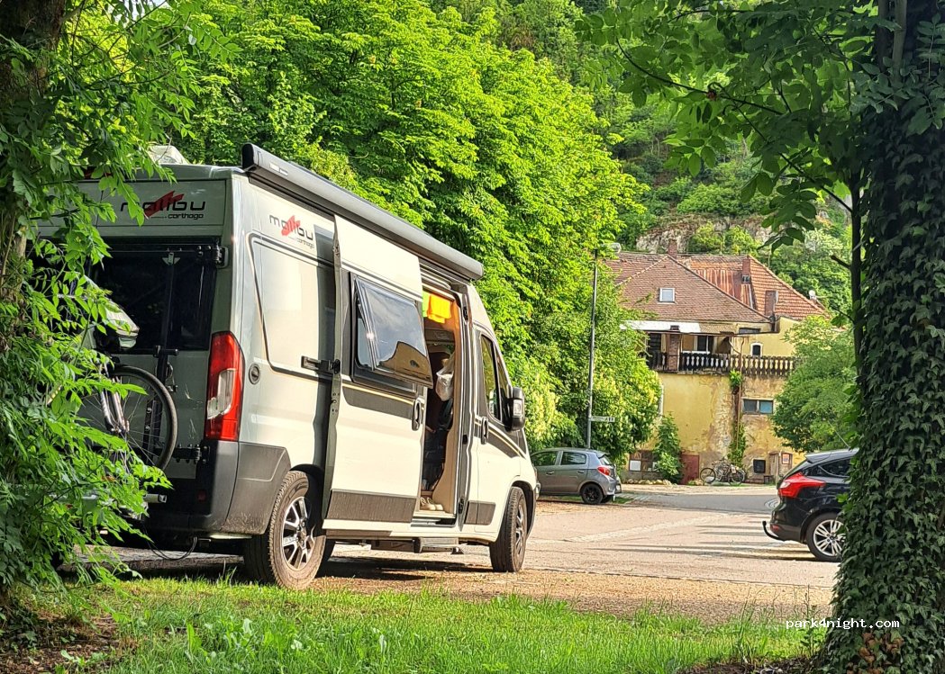 Es handelt sich eigentlich um einen PKW Parkplatz bei der Gemeindeverwaltung, auch parken viele Anwohner hier. Bullis haben kein Problem. Für Wohnmobile ab 6 m wird es schwieriger, da stehen eigentlich nur 3 Plätze zur Verfügung. Wir hatten Glück und haben auch eine angenehme Nacht verbracht. Im Sommer könnten evtl. die Geräusche der Staustufe störend sein. Zufahrt unbedingt über Dinauer Str.