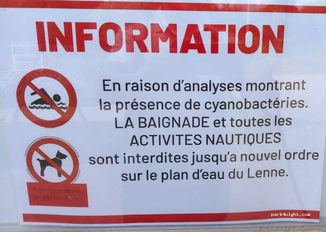 c est 8 places de parking pour les camping cars gratuites délimitées sans arbres à côté de la salle des fêtes Un peu serrés les uns aux autres a mon goût la baignade est autorisée dans le lac elle est surveillée à certaines heures de la journée durant l été très jolie balade a faire autour du lac commerces a proximité merci a la mairie