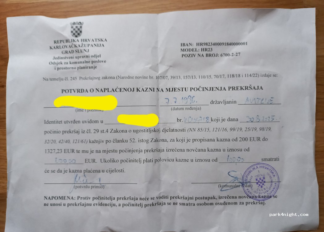 Achtung beim Übernachten! Wild campen ist in Kroatien generell untersagt und wird hier täglich in der Früh von einem Mitarbeiter der Stadt Slunj kontrolliert und auch geahndet. Wir wurden um 7:00 geweckt und haben eine Strafe von 100 € erhalten. Das ist das unterste Ende des Strafrahmens, dieser geht bis 1327 €.