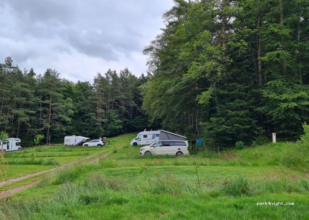 Für uns wäre dieser kleine, idyllische Platz eigentlich ein Geheimtipp. Man steht unter Bäumen im Schatten, hat seine Ruhe in der Natur und kann direkt vom Platz aus spazieren bzw. wandern gehen. Allerdings wurden wir wieder vom Platz gebeten, nachdem der Betreiber registriert hatte, dass unsere drei Hunde große Schäferhunde sind. Die Erklärung, dass es sich dabei um Rettungshunde handelt, war ihnen leider egal. Bei fast 40 Grad hätten wir einen Platz im Schatten jedoch gut gebrauchen können. Haben die Nacht dann auf dem Parkplatz einer Burgruine verbracht und sind dann problemlos am Tag darauf in Osenbach auf einem Campingplatz am Wald untergekommen.